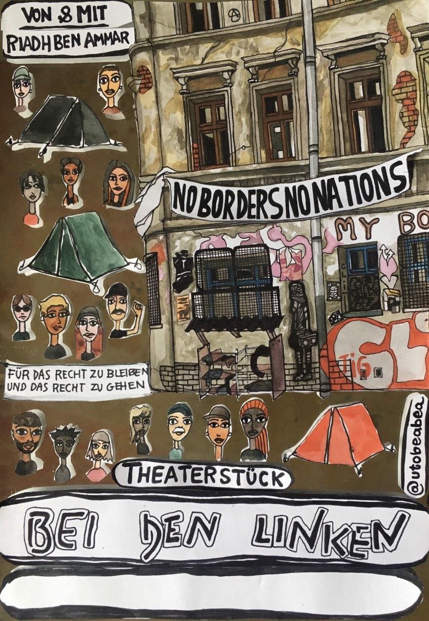 „Bei den Linken“ ist Teil des Projekts Theater für Bewegungsfreiheit, in dessen Rahmen Riadh bereits seit 2012 mit unterschiedlichen Stücken durch Europa tourt. Er lebt zwischen Tunesien und Deutschland, und ist Mitgründer des transnationalen Netzwerks Afrique-Europe-Interact. Er kritisiert die EU-Außengrenze und kämpft für das Recht auf Bewegungsfreiheit.