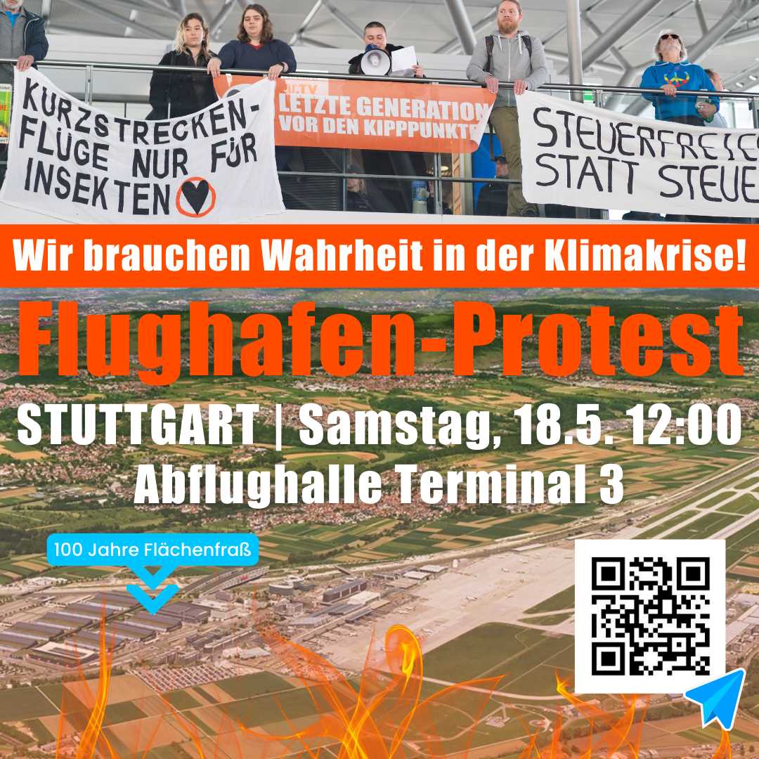 Wir machen da nicht länger mit: Pseudoklimaschutz und Ungerechtigkeit, steuerfreies Kerosin statt steuerfreier ÖPNV, subventionierte Privatjets und Kurzstreckenflüge nach Frankfurt und München, statt Erhalt der Gäubahn - es gibt 100 Gründe am 16.3. bunt, friedlich und entschlossen am STR zu demonstrieren: So geht es nicht weiter! Wir lassen uns nicht mit Märchen von “klimaneutralen” Wasserstoff-Fliegern und Ablenkungsmanövern für kurzfristige fossile Profite um unsere Zukunft betrügen! 10 Millionen Passagiere pro Jahr, das sind Millionen Tonnen CO2. Der klimaschädlichste Ort im Ländle!