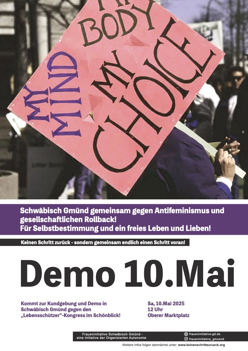 Demo am Samstag, den 10. Mai in Schwäbisch Gmünd Keinen Schritt zurück – Schwäbisch Gmünd gemeinsam gegen Antifeminismus und gesellschaftlichen Rollback! Für Selbstbestimmung und ein freies Leben und Lieben!