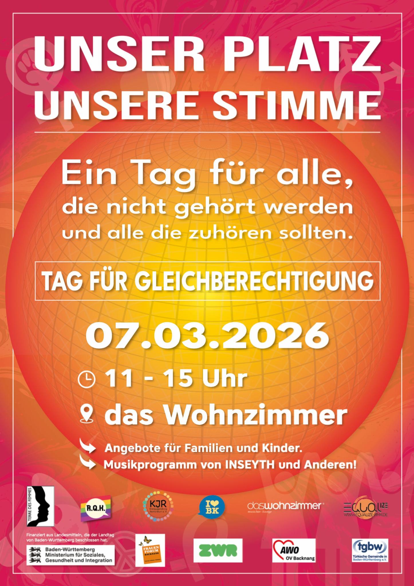 Der "Tag der Gleichberechtigung" findet am 07.03. Im "Wohnzimmer" am Willy-Brandt-Platz in Backnang statt.