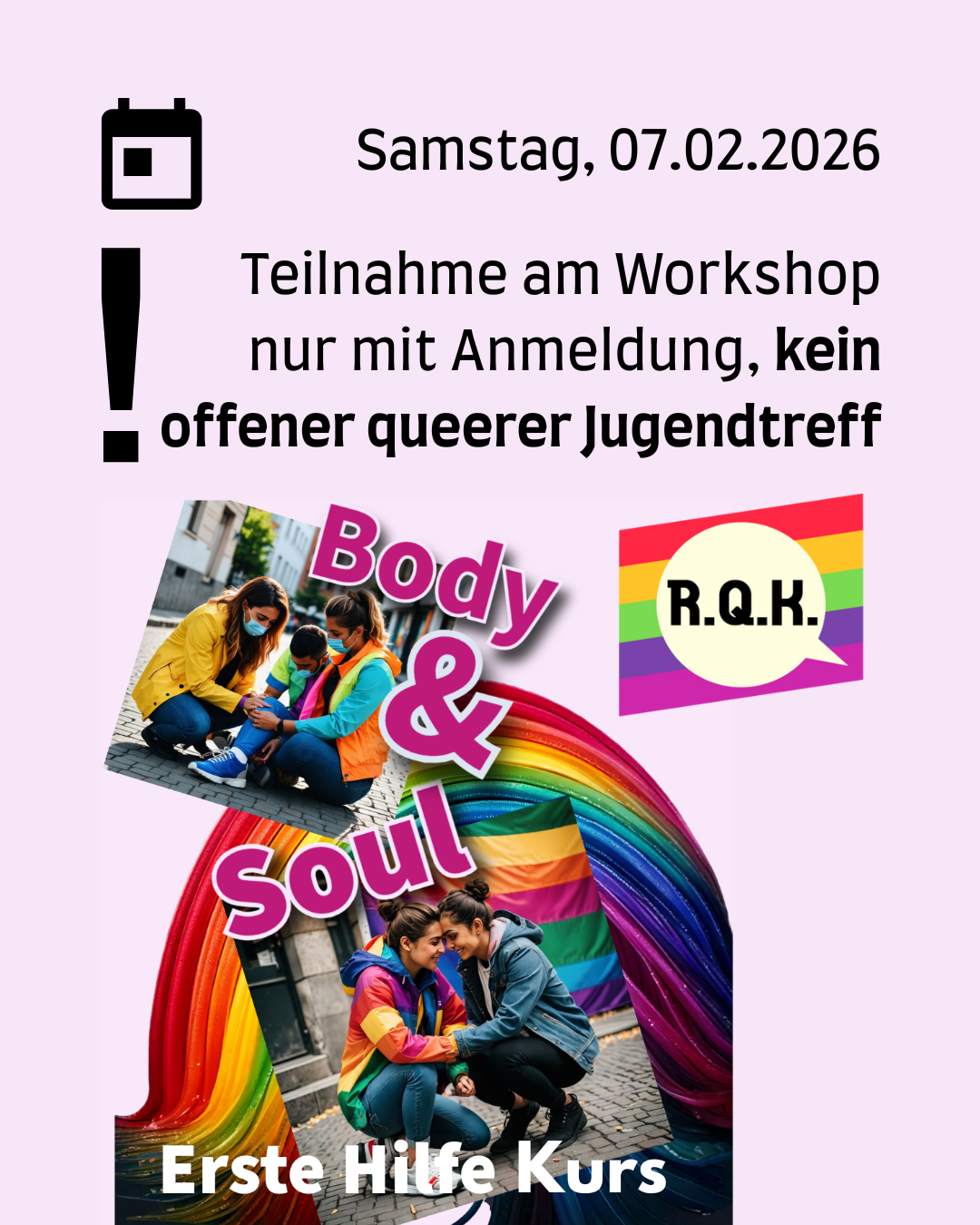 📅 Der kostenlose Kurs findet am 07.02.2026 von 10 bis etwa 18 Uhr statt. Veranstaltungsort ist die Mobile Jugendarbeit Backnang im 1. Obergeschoss der Mühlstraße 3. An diesem Tag findet leider kein regulärer Jugendtreff statt. Am Workshop teilnehmen können queere Jugendliche ab 14 Jahren und queere Erwachsene. Bei diesem Kurs sind Queers über 27 Jahren explizit eingeladen!