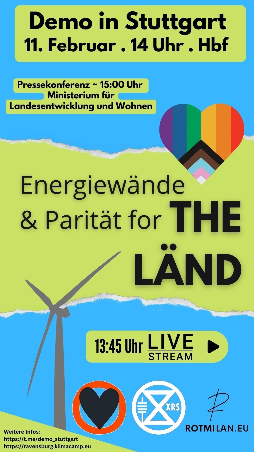 Es ist allerhöchste Zeit für gerechte Parität in Machtpositionen und mehr Tempo bei der Energiewende. Wir sind ein Klimakollektiv mit Menschen aus Ulm, Oberschwaben, Stuttgart und weiteren Orten. Am Samstag, 11.02 um 14:00 Uhr, treffen wir uns in Stuttgart am Hauptbahnhof und demonstrieren gemeinsam für Klimagerechtigkeit, kommst du auch mit? Weitere Infos findest du auf https://rotmilan.eu oder auf Telegram https://t.me/demo_stuttgart