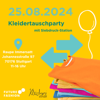 WIE FUNKTIONIERT’S? ➜ Bringe ca. 5 Teile (maximal 10) gut erhaltene und gewaschene „Schrankhüter“ mit, die anderen noch eine Freude machen! ➜ Das können Kleidungsstücke, Schuhe, Accessoires & Schmuck sein (No-Go: defekte/dreckige Kleidung, Strumpfwaren & Unterwäsche). ➜ All sizes and genders are welcome! ➜ Die Tauschstücke gibst du beim Check-In ab und dann… ➜…wird getauscht! Bummel über die Tauschfläche und gib anderen Lieblingsstücken ein neues Zuhause! ➜ Du kannst so viele Stücke mitnehmen, wie du mitgebracht hast. Eins mehr oder weniger ist natürlich auch okay. ➜ Es gibt Spiegel und Ankleidemöglichkeiten, damit das Ertauschte auch möglichst gut ausgewählt und weiterhin viel getragen wird. WARUM? Je länger ein Kleidungsstück getragen wird, desto weniger belastet es die Umwelt. Schenke aussortierten Kleidungsstücken ein neues Leben und tausche sie gegen andere Lieblingsteile ein – ohne dabei Ressourcen zu verschwenden! #TauschDichGlücklich Daneben findet ihr Infostände von Future Fashion und der Kleiderei Stuttgart und könnt bei Sabrina an der Siebdruckmaschine eure eigene Textilkunst schaffen. Und wie immer im foodsharing-Café könnt ihr euch vor, während und nach dem Tausch mit kostenlosen geretteten Lebensmitteln aus dem Fairteiler stärken. Außerdem gibt’s an der Bar leckere nachhaltige Getränke, deren Preis ihr nach einem solidarischen Prinzip selbst bestimmen dürft und somit den Erhalt des Cafés sichert. Kommt vorbei, das wird ein Fest!