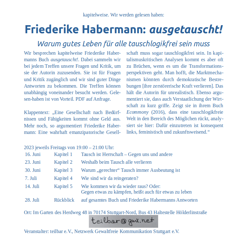 Wir besprechen kapitelweise Friederike Habermanns Buch ausgetauscht!. Dabei sammeln wir bei jedem Treffen unsere Fragen und Kritik, um sie der Autorin zuzusenden. Sie ist für Fragen und Kritik zugänglich und wir sind guter Dinge Antworten zu bekommen. Die Treffen können unabhängig voneinander besucht werden. Gelesen-haben ist von Vorteil. PDF auf Anfrage.