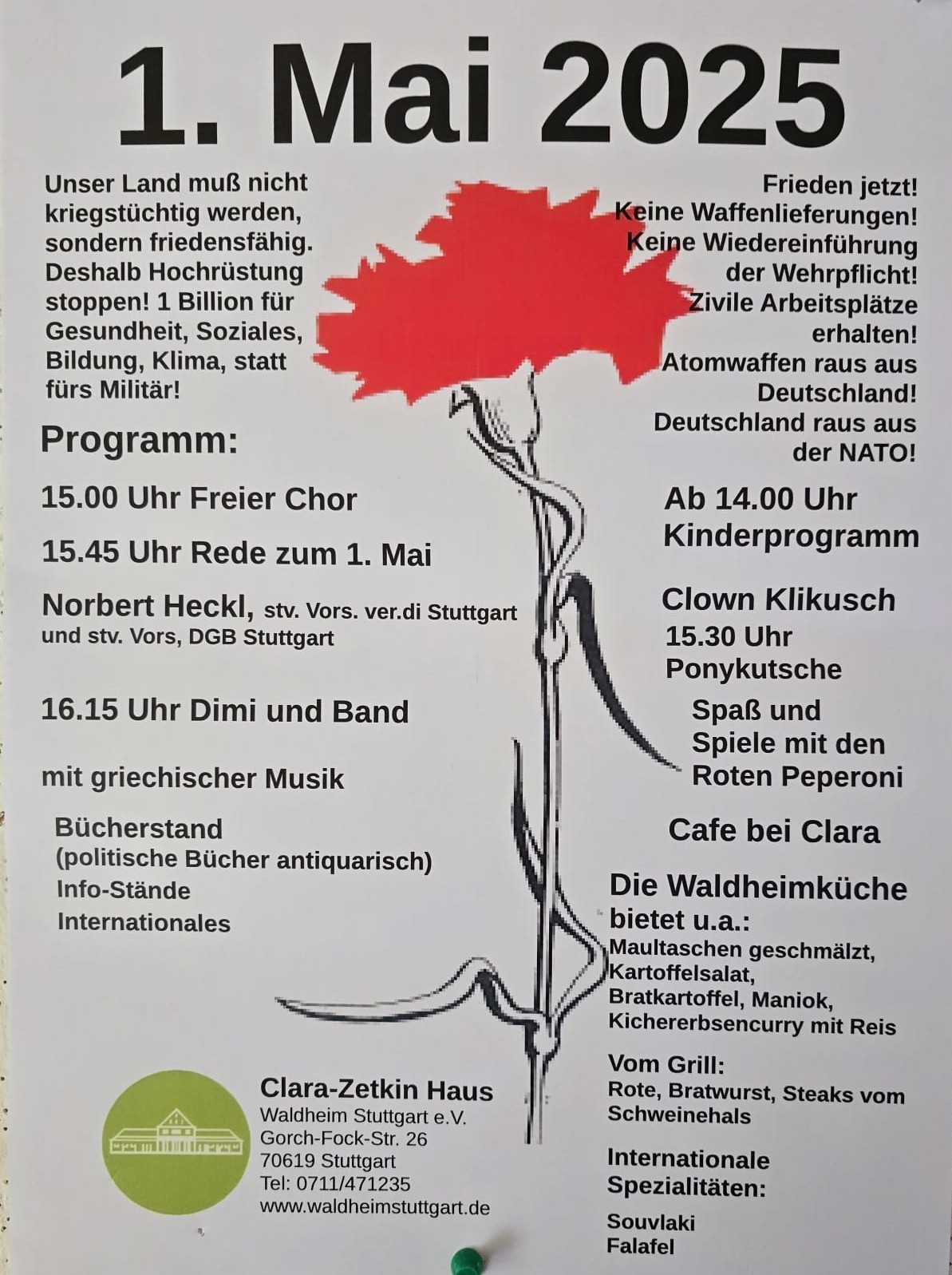 Viel Spaß und Genuss ist bei dieser 1. Mai-Veranstaltung im Clara-Zetkin-Haus garantiert: tolle Spiele für Kinder, Auftritte der griechischen Gruppe "Dimitrios und Freunde" (ab ca. 16:15 Uhr) sowie des Freien Chors Stuttgarts (ca. 15 Uhr) ... und natürlich Kulinaria aus (fast) der ganzen Welt.