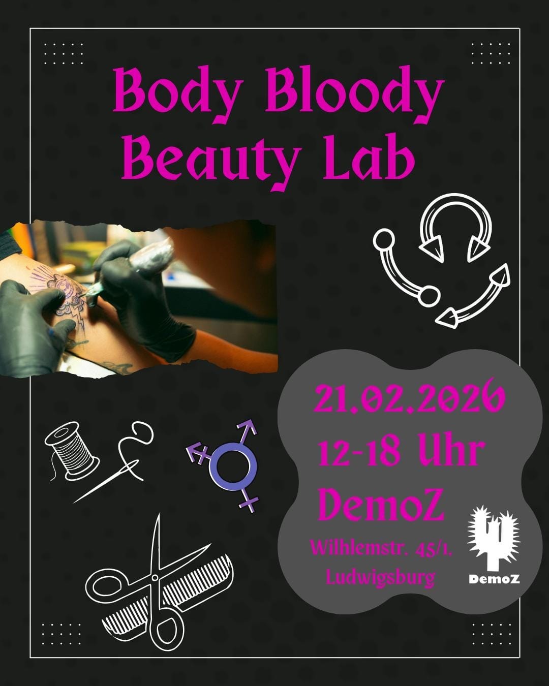 Wir wollen allen Menschen die Möglichkeit geben ihren Körper und Aussehen so zu verändern wie sie wollen, unabhängig wie voll der Geldbeutel ist. Von Kleidung aufpimpen mit coolem Stoff + fancy Patches übers Haare färben oder Sidecuts rasieren bis hin zu Tattoos, Piercings, Cuttings (mit Glow in the Dark Effekt) und Implantaten ist alles dabei. Außerdem könnt ihr etwas über DIY Hormon Therapie lernen. Am 21.02. sind DIY Body Modifications volles Programm.