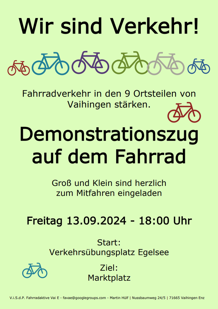 "Wir sind Verkehr" Bei unseren Nachbarn in Vaihingen Enz formt sich eine Initiative . Freitag 13.09 18 Uhr geht es los am Verkehrsübungsplatz Egelsee, südlich der Enz. Kommt gerne vorbei.