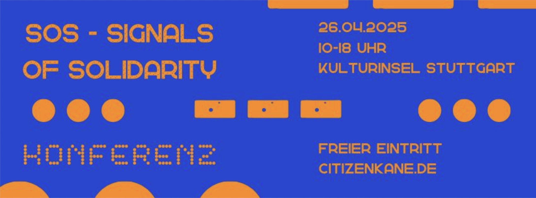 Das Citizen.KANE.Kollektiv sucht nach Möglichkeiten der positiven Veränderung. Wir sind davon überzeugt, dass wir Zusammenhalt brauchen. Solidarität lokal und global. Solidarität zwischen Künstler*innen und Solidarität mit marginalisierten Gruppen. Deshalb laden wir nach Stuttgart zur Konferenz „SOS - Signals of Solidarity“ ein. Gemeinsam wollen wir von Best Practice Beispielen lernen und uns vernetzen.