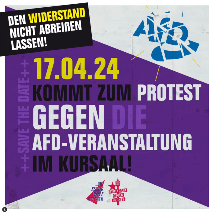 Am Mittwoch, 17.04. will die AfD einen sogenannten „Bürgerdialog“ im städtischen Bürgerhaus, dem Kursaal in Stuttgart Bad Cannstatt, durchführen. Um 17.15 Uhr beginnen wir mit einer Kundgebung auf dem Wilhelmsplatz in Cannstatt und ziehen dann als Demonstrationszug vor den Kursaal, um die AfD zu stören. Es ist die erste AfD Veranstaltung in unserer Stadt – seit der Veröffentlichung der Deportationspläne der Rechten und den darauf folgenden riesigen Protesten in Stuttgart und vielen anderen Städten. Mit unserem Protest wollen wir auch deutlich machen, dass es notwendig ist, den Widerstand gegen die AfD nach erfolgreichen Großprotesten nicht einzustellen sondern dass wir viel Ausdauer und Unterstützer*innen brauchen, um uns gegen die AfD zu stellen und sie wirkungsvoll einzuschränken.