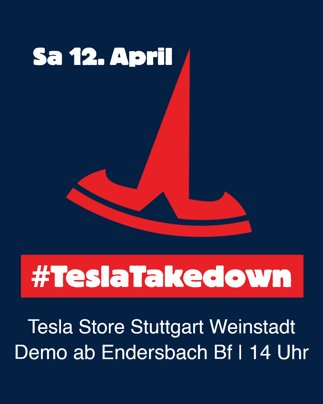 Wir, TeslaTakedown Stuttgart, rufen auf zur Demonstration und Kundgebung am 12.04.2025 in Weinstadt-Endersbach (Tesla-Filiale für den Raum Stuttgart) unter dem Motto #TeslaTakedown.