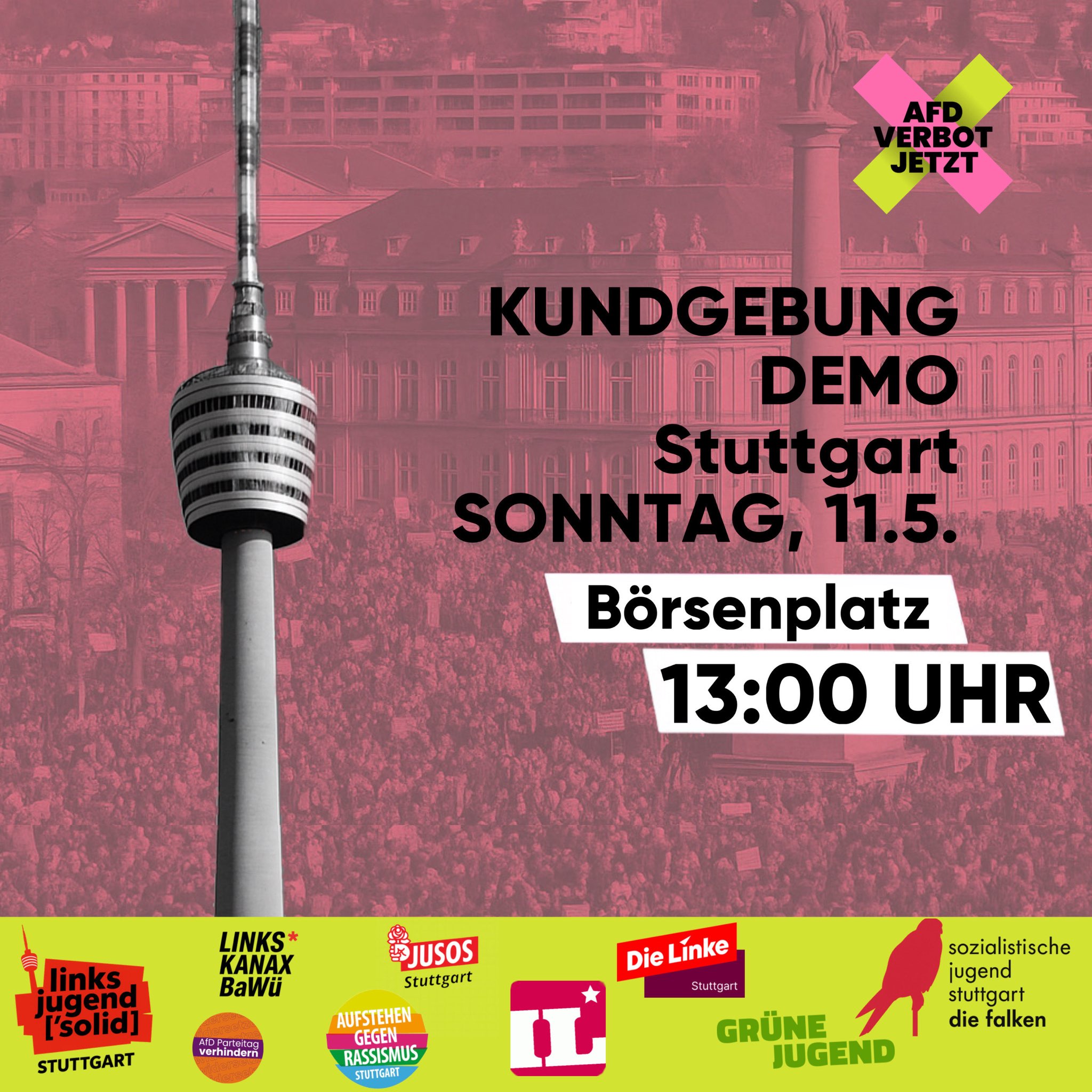 Am Sonntag, den 11. Mai, um 13:00 Uhr versammeln sich auf dem Börsenplatz in Stuttgart zahlreiche Organisationen und Bündnisse, um gemeinsam ein klares Zeichen gegen rechte Hetze und für ein Verbot der AfD zu setzen.
