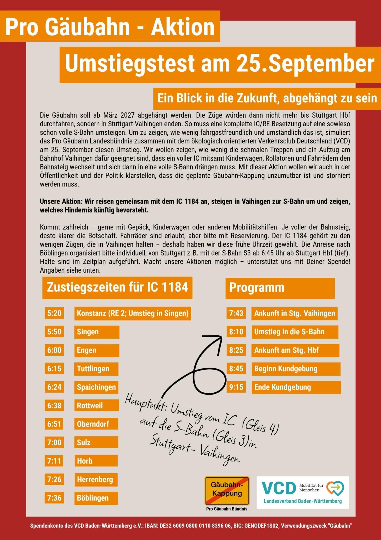 Die Gäubahn soll ab März 2027 abgehängt werden. Die Gäubahn-Züge würden dann nicht mehr bis Stuttgart Hbf durchfahren, sondern in Stuttgart-Vaihingen enden. Hier müsste dann ein kompletter IC/RE auf eine sowieso schon volle S-Bahn umsteigen. Um zu zeigen, wie wenig fahrgastfreundlich und umständlich das ist, veranstaltet das Pro Gäubahn Landesbündnis zusammen mit dem ökologisch orientierten Verkehrsclub Deutschland (VCD) am 25. September eine Umsteigeaktion. Wir wollen zeigen, wie wenig die schmalen Treppen und ein Aufzug am Bahnhof Vaihingen dafür geeignet sind, dass ein voller IC mitsamt Kinderwägen, Rollatoren und Fahrrädern den Bahnsteig wechseln und sich dann in eine volle S-Bahn drängen muss. Mit dieser Aktion wollen wir auch der Öffentlichkeit und der Politik zeigen, dass die geplante Gäubahn-Kappung unzumutbar ist und storniert werden muss.