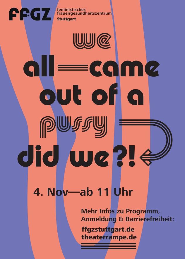 Diskutieren, informieren, enttabuisieren: Am 4. November 2023 kehrt das FF*GZ Stuttgart e.V. mit der vierten Edition von „We all came out of a pussy“ in die RAMPE und somit an den Geburtsort des Festivals zurück. Unter dem Zusatz „did we?!“ hinterfragen wir von der Geburt ausgehend einen Tag lang bestehende gesellschaftliche Normen und Strukturen rund um die Themen Elternschaft, Verteilungsgerechtigkeit und vielfältige Familienformen.