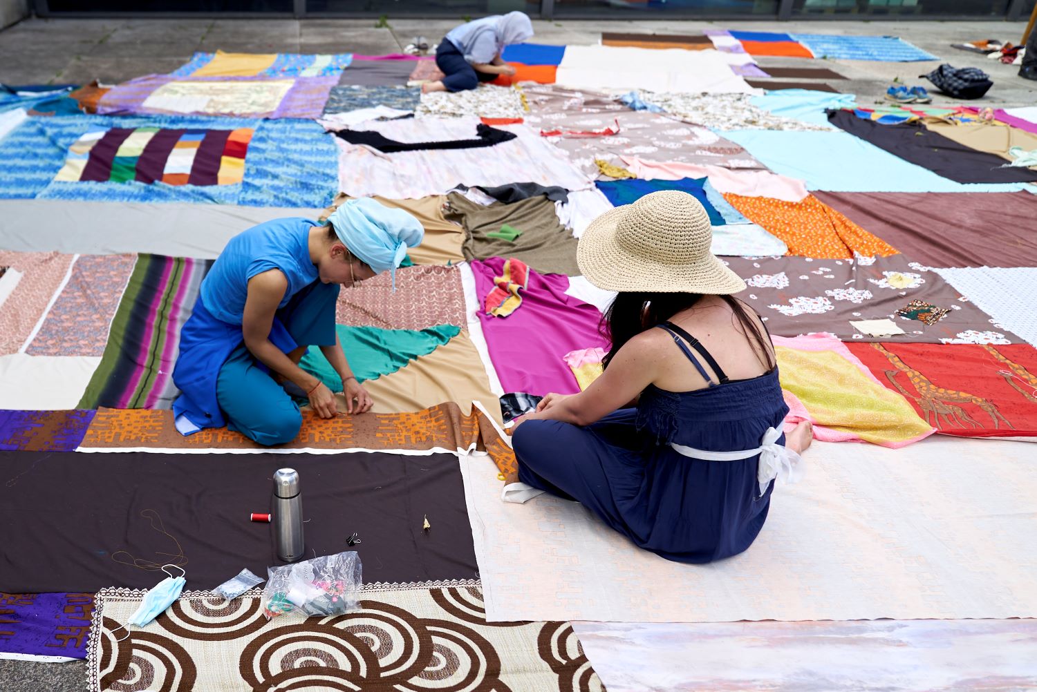 Eine Unterhaltung im Freien ist eine gemeinsam gelebte Utopie. Aus mitgebrachten Stoffstücken fertigen wir eine Picknickdecke — als einen wachsenden Raum für Unterhaltungen, geteilte Erfahrungen und Ideen. Wir tauschen uns über unsere persönlichen Lebenswelten aus, zudem über die gesellschaftliche Realität, in der sie sich verorten. Wir nehmen auseinander und fügen neu zusammen. Die Picknickdecke wird dabei zum Träger, auf dem Geschichten, wie auch Anmerkungen und Fragen Stück für Stück miteinander reagieren und sich verbinden. Wir wünschen uns langfristig wachsende Unterhaltungen.