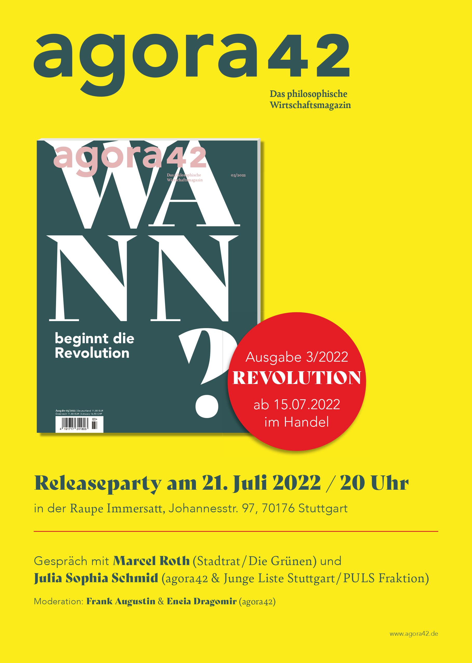 Unsere Freund*innen der agora42, einem super spannenden philosophischen Wirtschaftsmagazin mit Sitz in Stuttgart, feiern das Erscheinen ihrer neuen Ausgabe. Das Ganze findet am 21. Juli in der Raupe statt, gepaart mit einer Gesprächsrunde mit Julia Sophia Schmid (agora42 & Junge Liste Stuttgart / PULS Fraktion) und Marcel Roth (Stadtrat / Die Grünen), moderiert von Frank Augustin und Eneia Dragomir (beide agora42).