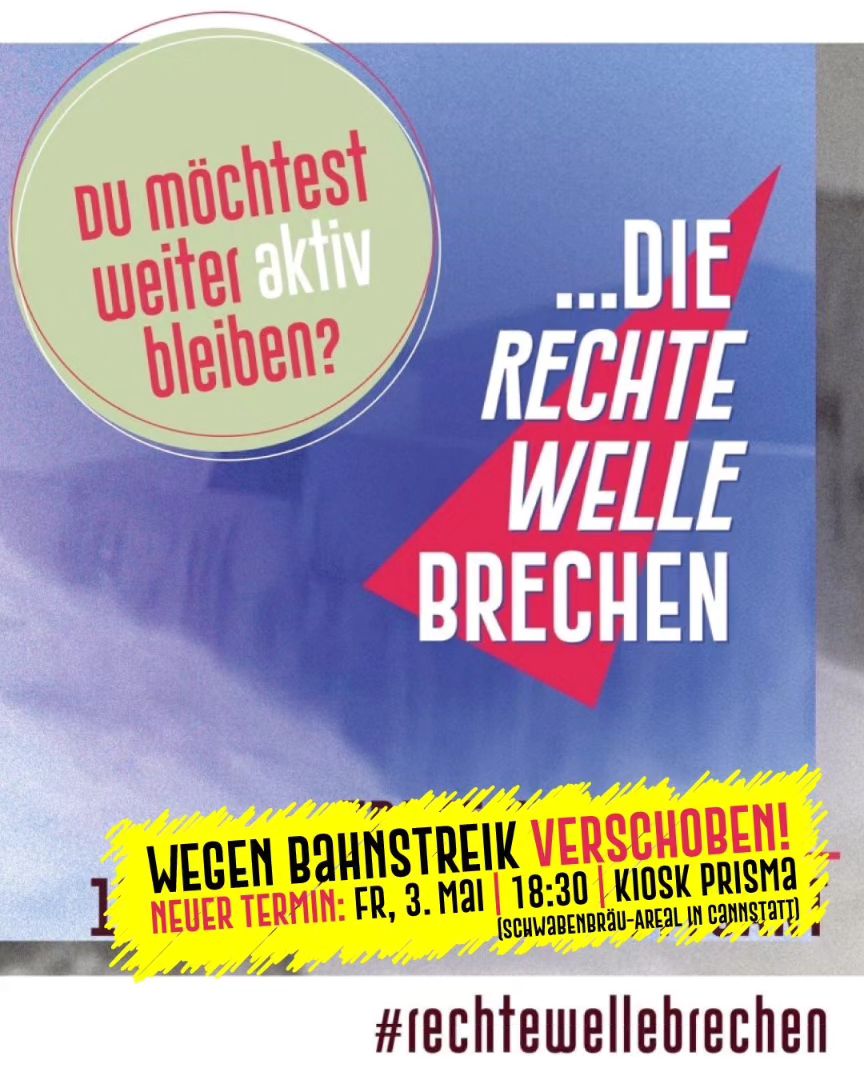 Du warst bei der Demo dabei oder hast uns bei der Vorbereitung unterstützt? Du möchtest weiter gegen Rechts aktiv bleiben oder jetzt endlich loslegen? Dann komm am 19.4. in den Kiosk Prisma nach Cannstatt. Beim Treffen stellen sich Initiativen vor, die bei #rechtewellebrechen dabei waren und wo du dich einbringen kannst. Es gibt die Möglichkeit Organisationen und Mitstreiter*innen kennen zu lernen und ins Gespräch zu kommen.