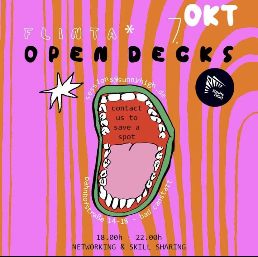 Nach der Sommerpause sind auch die FLINTA* Open Decks wieder zurück! Am Montag 07.Oktober von 18-22 Uhr habt ihr die Chance euch hinter den Decks auszuprobieren und euch untereinander auszutauschen. Am Anfang wird es eine kleine Kennenlernrunde und eine Einführung in das Sunny High DJ Equipment geben.