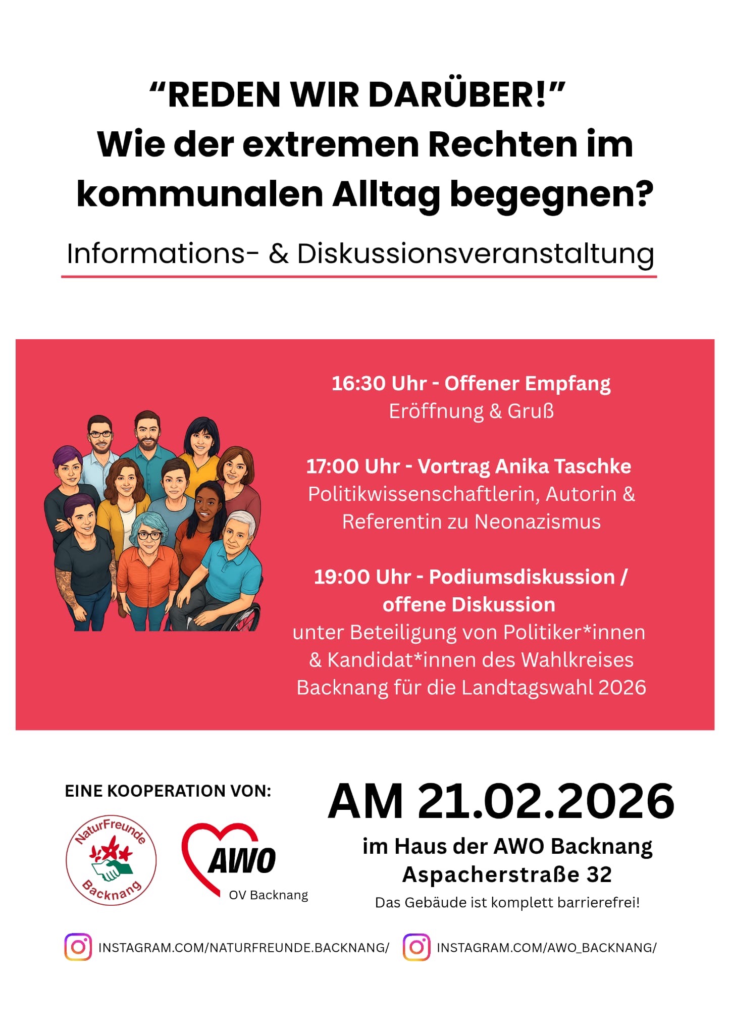 Am Samstag, den 21.02.2026, findet im Haus der AWO, Aspacher Straße 32, 71522 Backnang, eine Veranstaltungskooperation des AWO OV und der NaturFreunde Backnang zum Thema „Reden wir darüber! Wie der extremen Rechten im kommunalen Alltag begegnen?" statt.