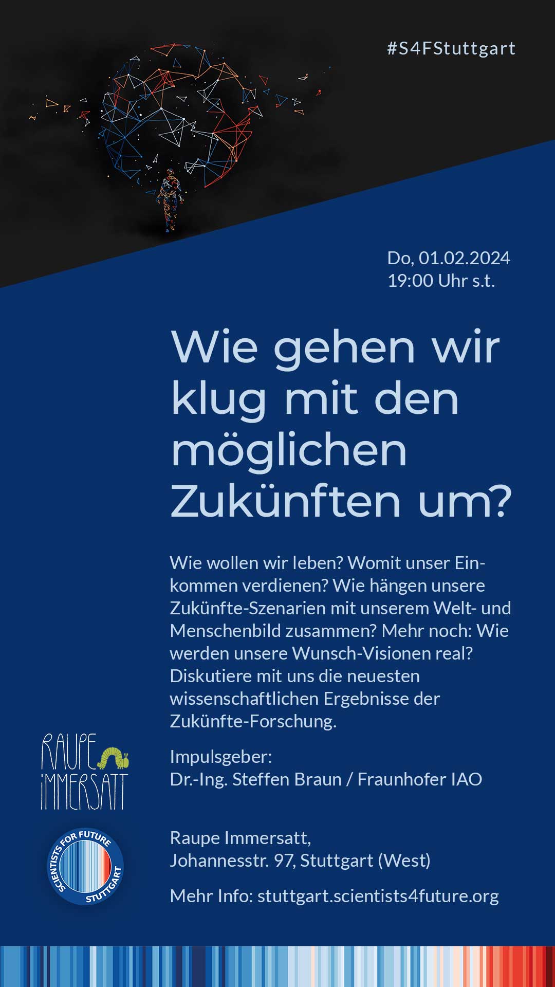 Wie wollen wir leben? Womit unser Einkommen verdienen? Wie hängen unsere Zukünfte-Szenarien mit unserem Welt- und Menschenbild zusammen? Mehr noch: Wie werden unsere Wunsch-Visionen real? Diskutiere mit uns die neuesten wissenschaftlichen Ergebnisse der Zukünfte-Forschung.