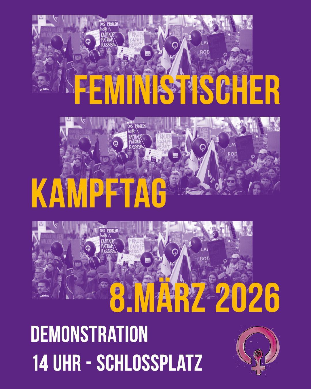 Wir kämpfen für eine Gesellschaft, in der alle Geschlechter gleichberechtigt leben. Für ein System in dessen Zentrum die kollektive Fürsorge steht! Dafür gehen wir am 08. März, dem internationalen feministischen Kampftag, gemeinsam auf die Straße. Bist du dabei?