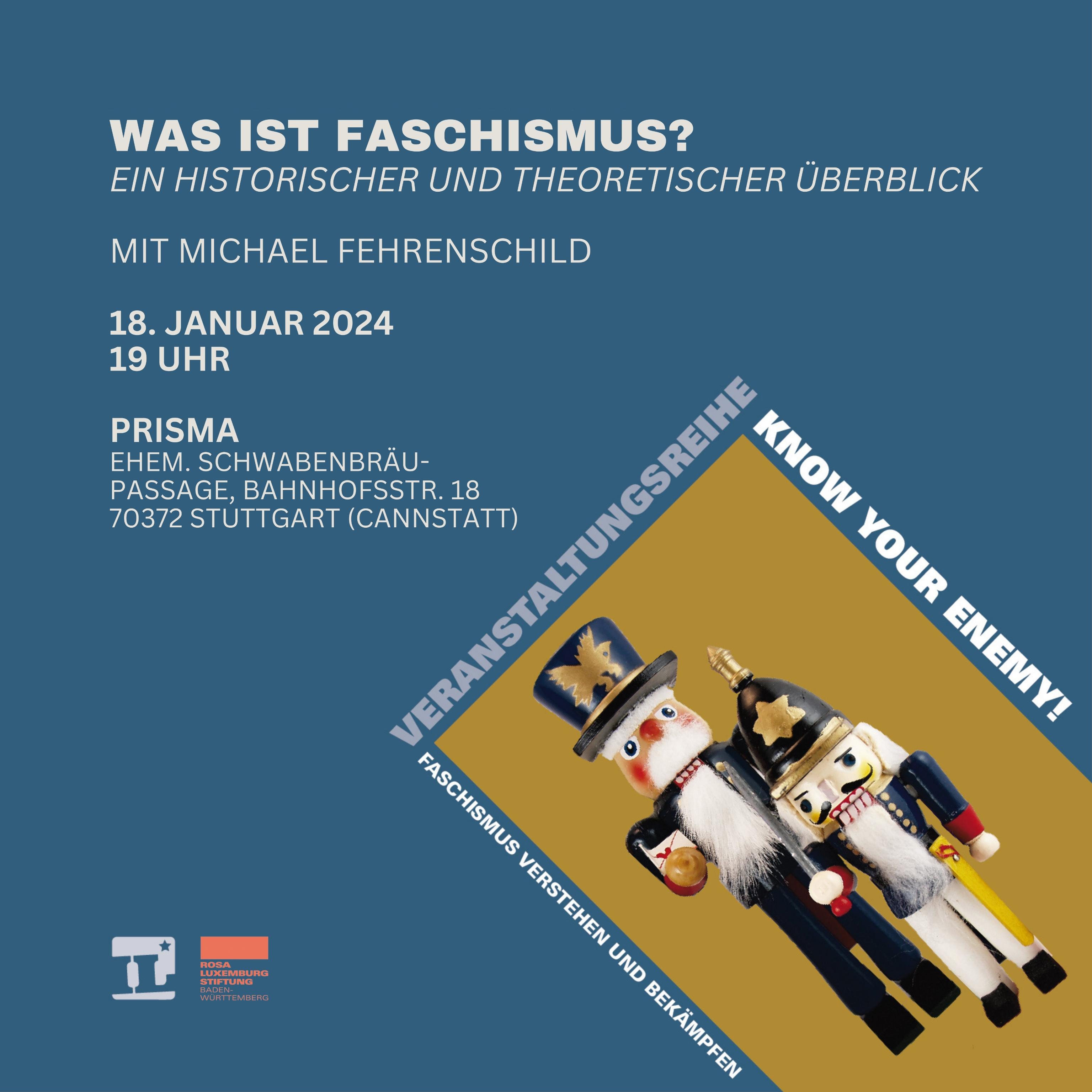 Wir starten unsere Veranstaltungsreihe “Know your enemy!” mit Michael Fehrenschilds Vortrag "Was ist Faschismus? Ein historischer und theoretischer Überblick". Im Zentrum des Vortrages steht eine Einführung in die Geschichte des Faschismus sowie verschiedene Ansätze zu dessen Erklärung. Der Vortrag ist als Einführung sowie Vertiefung ins Thema Faschismusanalyse geeignet.