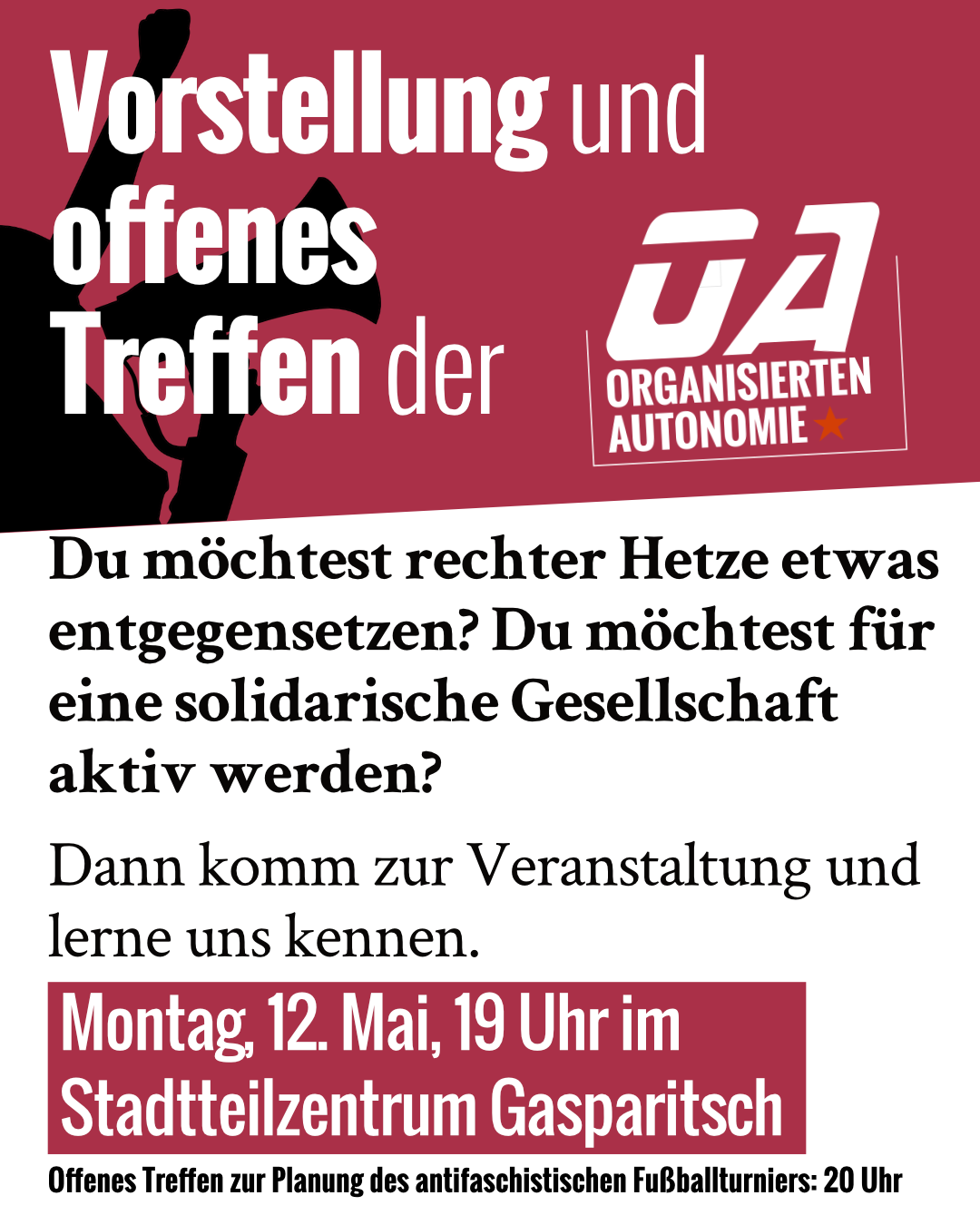 Konkret möchten wir ab 20 Uhr mit Dir gemeinsam das nächste antifaschistische Fußballturnier (+ X) in Stuttgart-Ost planen.