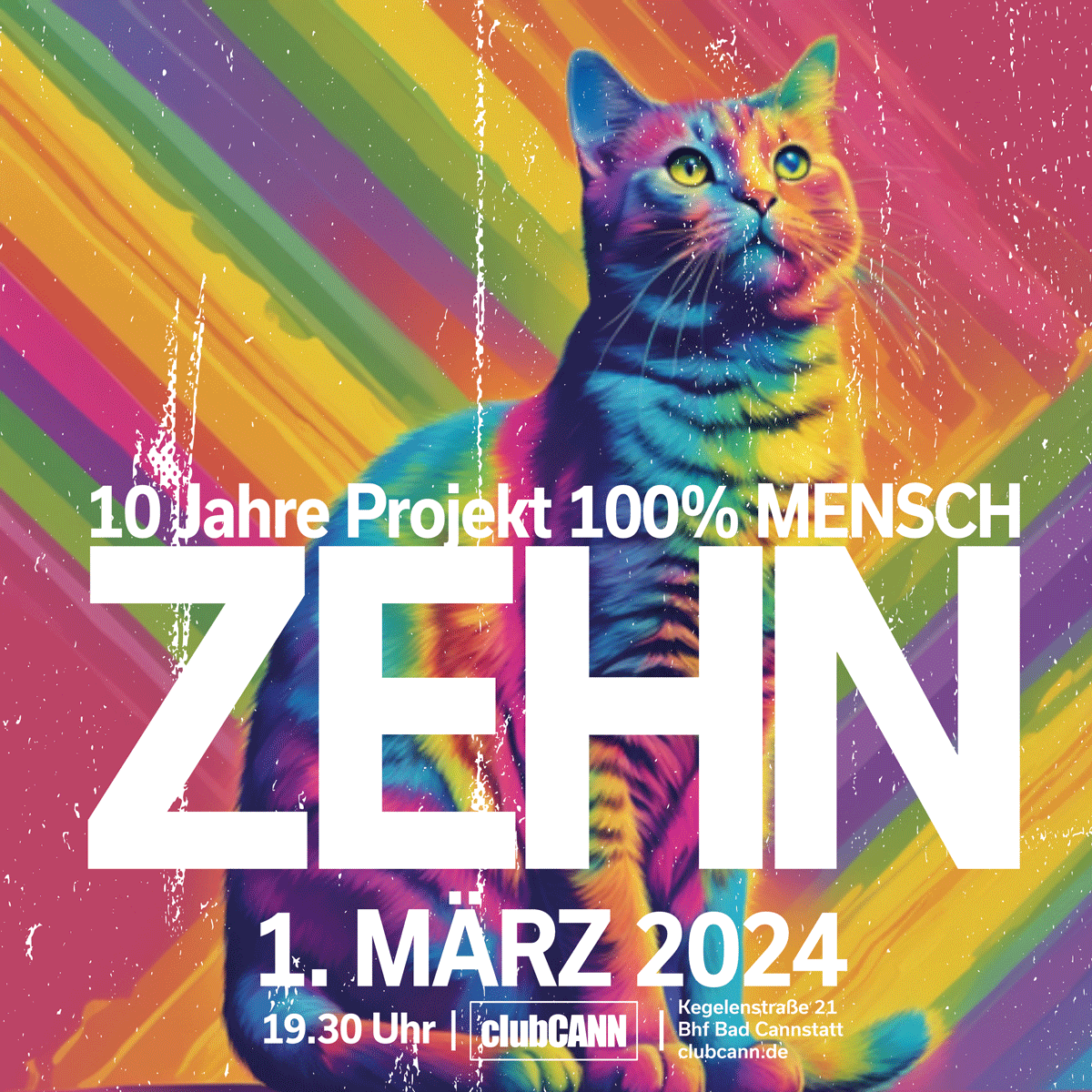 Wir wollen feiern! ZEHN Jahre Projekt 100% MENSCH! ZEHN Jahre queere Bildung und Sichtbarkeit! ZEHN Künstler*innen in einem Konzert! Freut Euch auf PopStar Daniel Schuhmacher, Elektrodiva und Antirassismus-Aktivistin Malonda, Berliner Elektropopperin LiLA, Folksängerin Hanne Kah, Popchamäleon Keye Katcher, den russisch-ukrainischen Popsänger und Aktivisten MKSM, Popsängerin Ela Querfeld, Entertainer und Sänger Shon Abram, Souldiva und Aktivistin Lili Sommerfeld sowie Nordstern, Sängerin und Aktivistin Annie Heger in der Moderation! Ein dreistündiges Konzert im Bad Cannstatter clubCANN. Tickets gibt es im Solidarsystem ab 10 €!