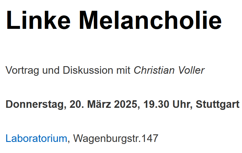 Was heißt linke Melancholie? Häufig wird damit der Zustand der gegenwärtigen Linken beschrieben, deren Enttäuschung über das Scheitern alternativer Gesellschaftsentwürfe in eine nachgerade ontologische Schwermut gekippt sei. Dagegen hielt bereits Walter Benjamin sie bereits in den 1920er Jahren für ein Symptom der Anpassung ans Bestehende. Christian Voller versucht, die kritischen Wurzeln des Begriffs freizulegen und dabei insbesondere die “Fähigkeit, sich zu ekeln” (Benjamin) gegen die Routine linker Trauerarbeit in Anschlag zu bringen.