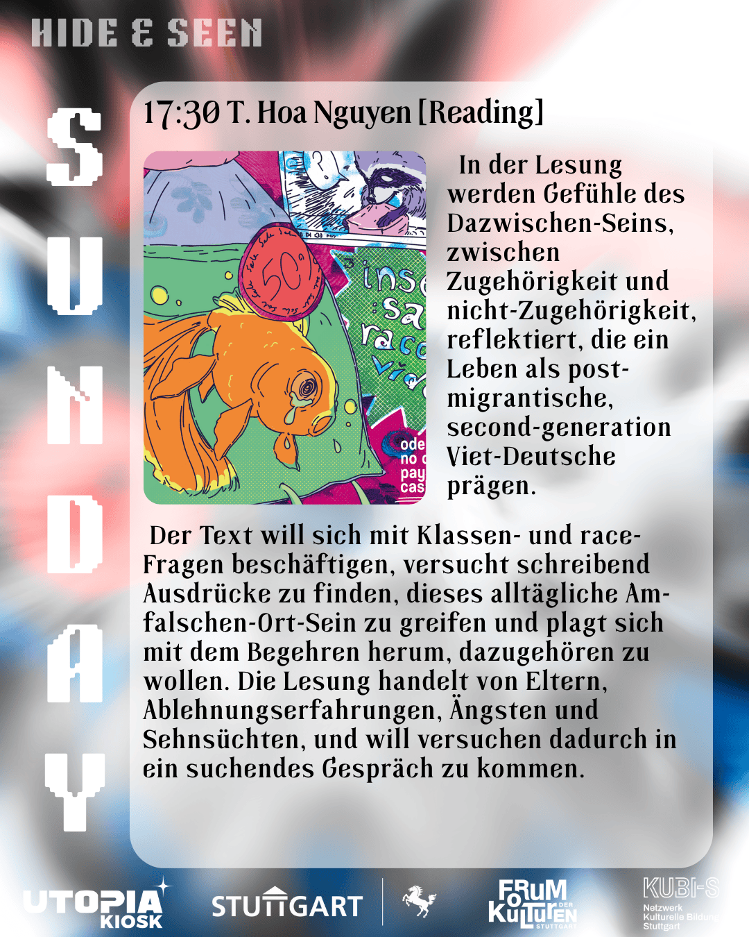 In der Lesung werden Gefühle des Dazwischen-Seins, zwischen Zugehörigkeit und nicht-Zugehörigkeit, reflektiert, die ein Leben als post-migrantische, second-generation Viet-Deutsche prägen. Der Text will sich mit Klassen- und race-Fragen beschäftigen, versucht schreibend Ausdrücke zu finden, dieses alltägliche Am-falschen-Ort-Sein zu greifen und plagt sich mit dem Begehren herum, dazugehören zu wollen. Die Lesung handelt von Eltern, Ablehnungserfahrungen, Ängsten und Sehnsüchten, und will versuchen dadurch in ein suchendes Gespräch zu kommen.