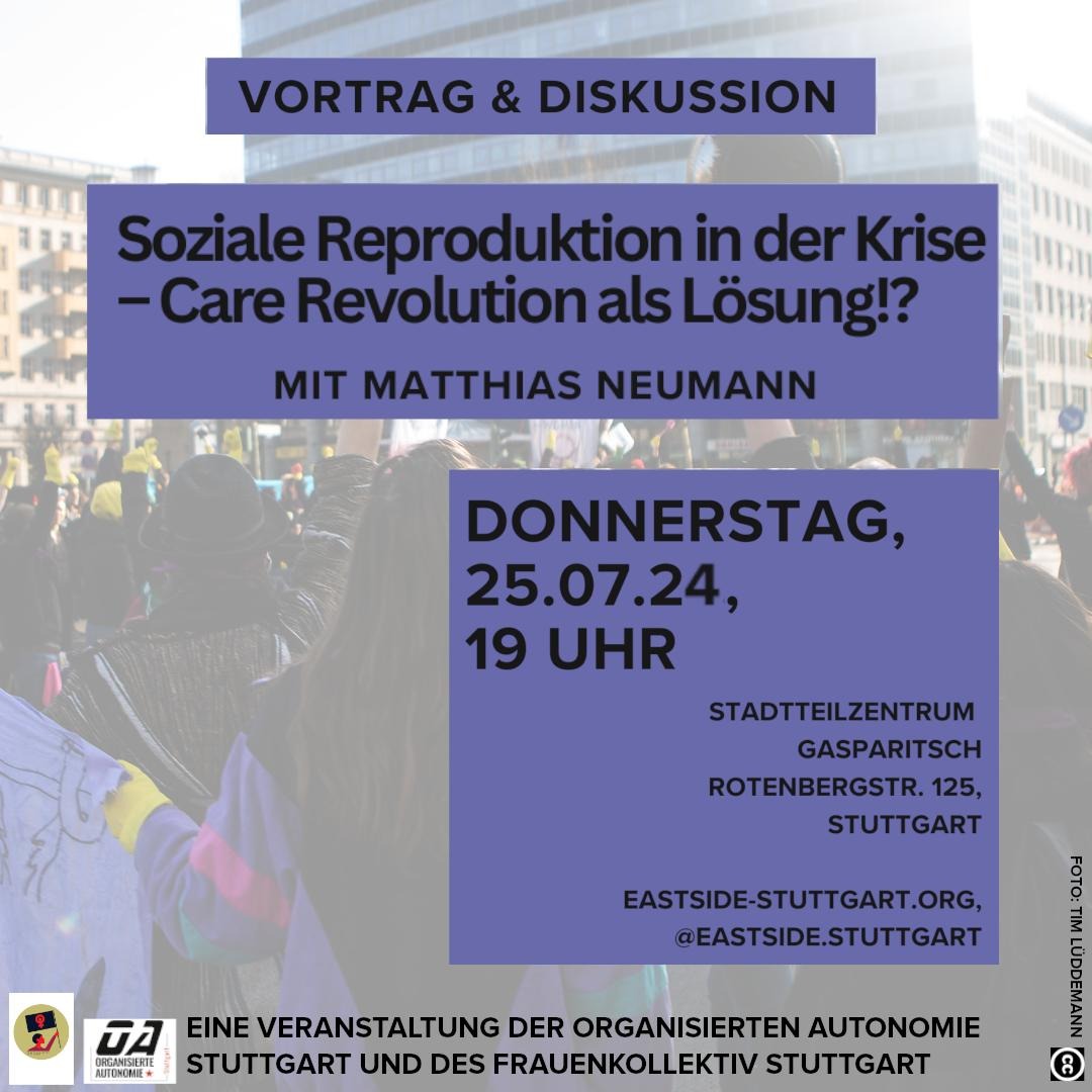 Zu diesen und weiteren Fragen wird Matthias Neumann in einem Vortrag mit anschließender Diskussion Stellung nehmen. Matthias Neumann ist aktiv im Netzwerk Care Revolution (www.care-revolution.org) und war an der Entstehung von Gabriele Winkers Buch "Solidarische Care-Ökonomie. Revolutionäre Realpolitik für Care und Klima" beteiligt.