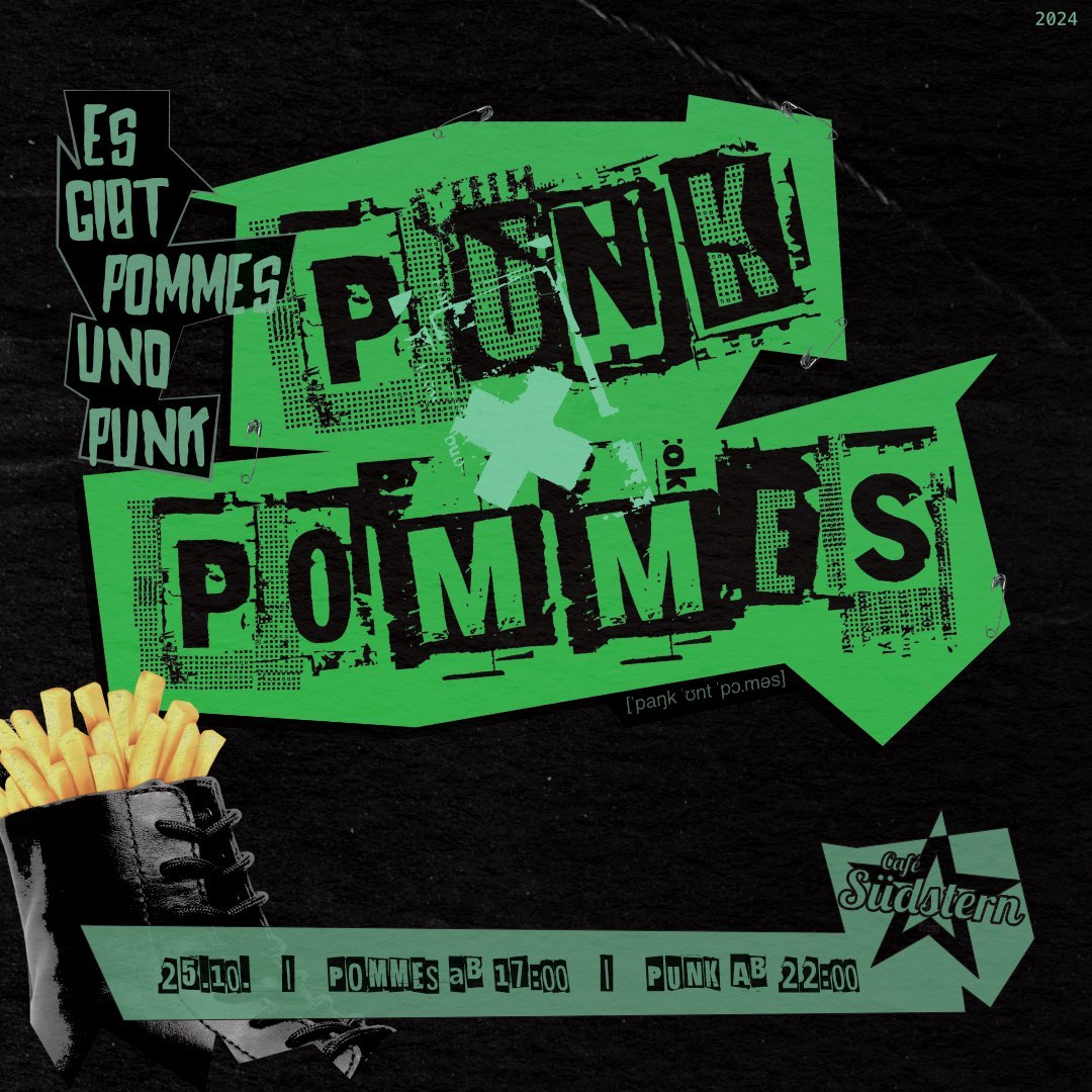 Die nächste Auflage von “Punk & Pommes” steht an. Los gehts am 25. Oktober ab 17:00 Uhr im Café Südstern bei uns im Lilo. Ab 22 Uhr Punk Musik. Wir freuen uns auf euch.