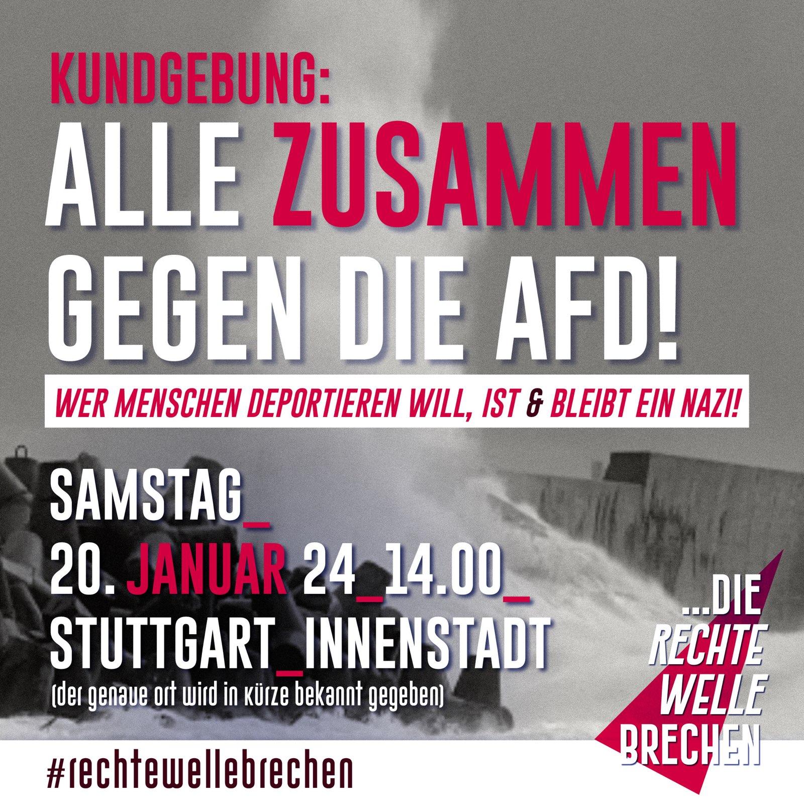 Die Kundgebung findet kommenden Samstag, 20.1. um 14 Uhr in Stuttgart statt. Der genauere Ort wird noch bekannt gegeben. Mit dem Protest am Samstag wollen wir auch einen Auftakt machen - am 24.2. findet in Stuttgart die überregionale Demonstration „Die rechte Welle brechen“ statt. Lasst uns jetzt damit anfangen!