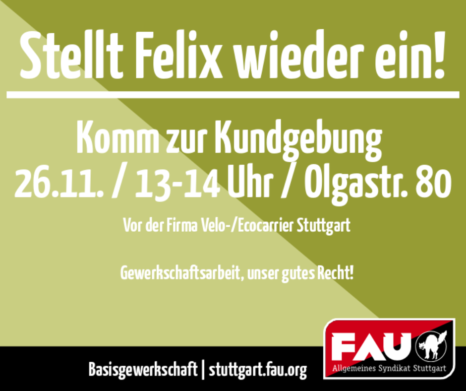 Die Firma Velo-/Ecocarrier hat unseren Kollegen Felix gekündigt. Er machte sich in der Firma stark für die Rechte seiner Kolleg*innen. Unter anderem sorgte er für passende Winterkleidung für die Radkuriere, die bei jedem Wetter unterwegs sein müssen. Pünktliche Lohnzahlungen war auch ein Thema, selbst bei einem Unternehmen dass sich nach außen hin so gerne modern und umweltbewußt präsentiert. Wenn aktive Gewerkschafter gefeuert werden, ist die Antwort für uns als FAU klar: So nicht! Ein Angriff auf eine:n, ist ein Angriff auf UNS ALLE! Deshalb komm zur