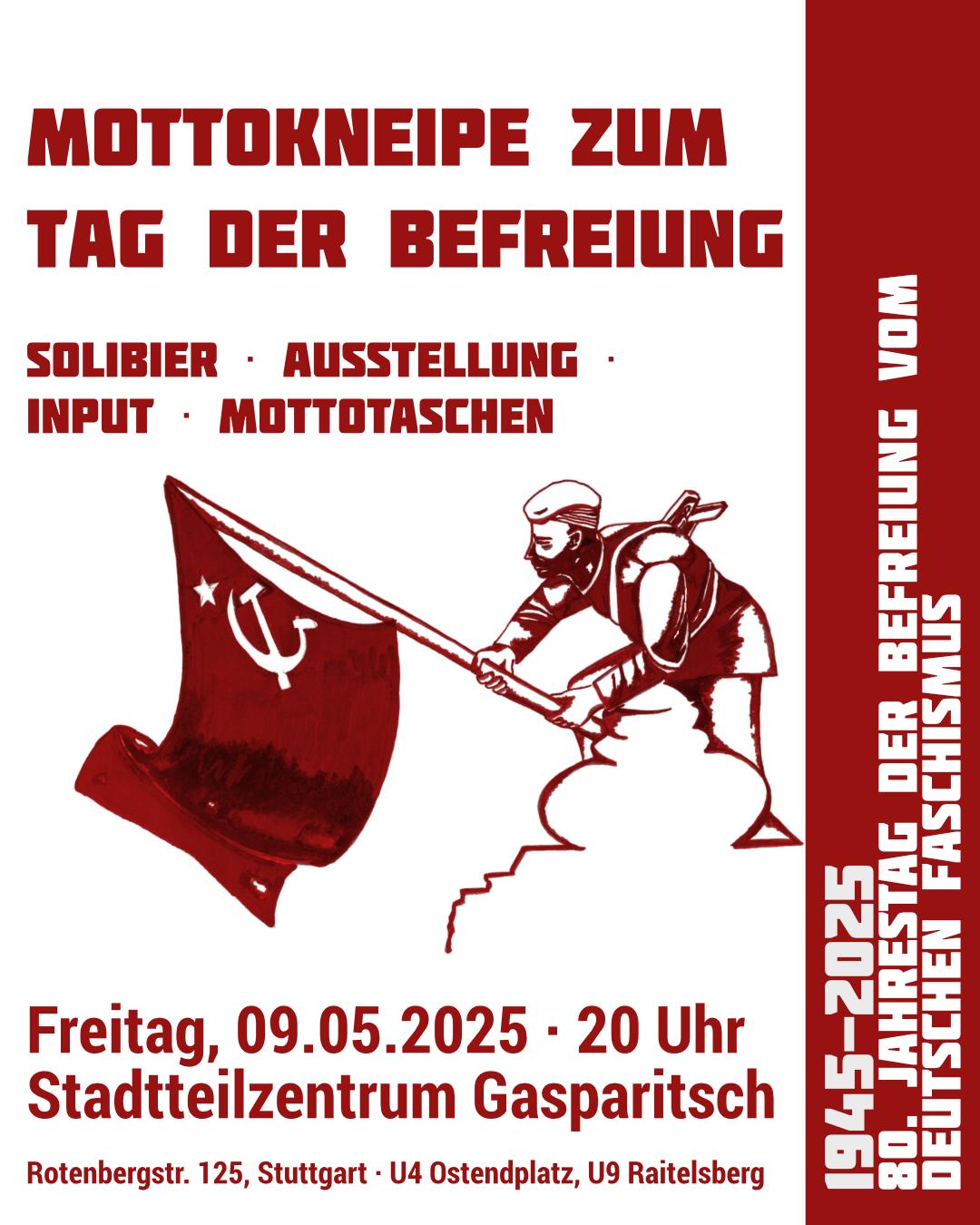 Am 8. Mai ist der 80. Jahrestag der Befreiung vom Faschismus. Das wollen wir im Rahmen einer speziellen Kneipe am 9. Mai im @stadtteilzentrum_gasparitsch thematisieren. Es gibt Solibier, eine Ausstellung und passende Taschen. Dazu natürlich Getränke, Essen und das in lockerer Atmosphäre.