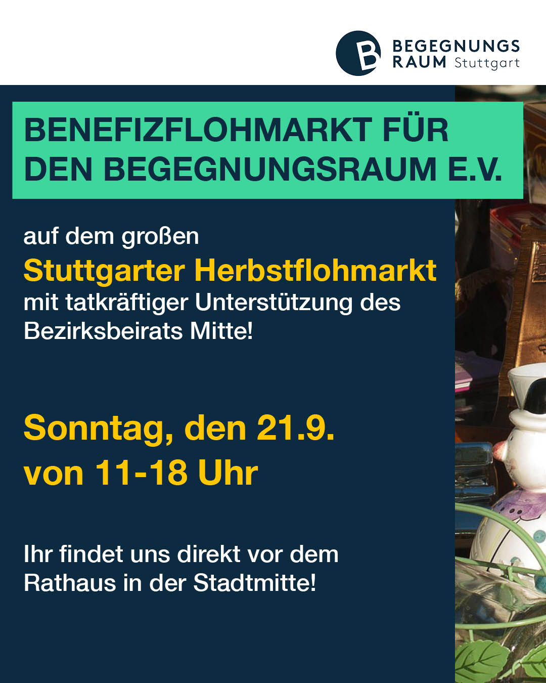Benefizflohmarkt für den Begegnungsraum e.V. auf dem großen Stuttgarter Herbstflohmarkt am 21.9. von 11-18 Uhr in der Stadtmitte! Der Verkaufserlös kommt zu 100% den Angeboten im Begegnungsraum zu Gute.