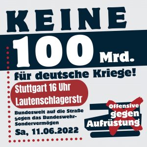 Im Rahmen der Offensive gegen Aufrüstung- Klassenkampf statt Burgfrieden Kampagne findet in Stuttgart, sowie in anderen deutschen Großstädten eine Demonstration gegen die angedachte 1 mal Zahlung von 100 Mrd. für Aufrüstung und Ausbau der Schlagkraft der Bundeswehr statt.