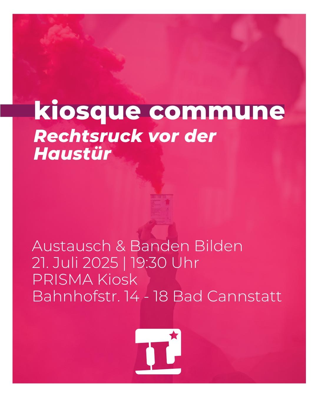 Dagegen hilft im ersten Schritt vor allem eins: Raus aus der Verzweiflung & Zusammenkommen! Im kiosque commune treffen wir mit allen, die auch Redebedarf haben, tauschen uns aus und disktutieren in entspannter Atmosphäre um voneinander zu lernen, Banden zu bilden und vor allem nicht alleine zu sein.