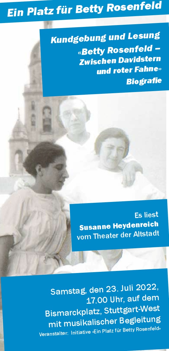 Betty Rosenfeld ist in Stuttgart-West aufgewachsen. Sie lebte mit ihrer jüdisch-liberalen Familie in der Breitscheidstraße, sie besuchte das Königin-Olga-Stift und wurde am Katharinenhospital zur Krankenschwester ausgebildet. Die politische Entwicklung in der Weimarer Republik ließ sie bald aktiv gegen die Nazis werden. Doch als Jüdin und Kommunistin sah sie sich in den dreißiger Jahren zweifach zur Flucht nach Palästina gezwungen. Aber bald war sie die einzige Frau aus Stuttgart, die sich in Spanien den Internationalen Brigaden anschloß, um dort für die Freiheit und gegen die Faschisten zu kämpfen. Ihr Lebensweg endete nach einer jahrelangen Odysee durch französchische Internierungs-Lager in Auschwitz.Die Erinnerung an Betty Rosenfeld, an ein beispielhaftes Leben für die Freiheit und soziale Gerechtigkeit darf jedoch nicht verschüttet bleiben. Daher soll ein Platz oder eine Straße im Stuttgarter Westen an sie erinnern. Etwa der Bismarck-Platz: Dieser müßte nicht länger für einen autoritären preußischen Politiker stehen, der alles andere als ein Demokrat war, dessen aggressive Außenpolitik drei Kriege vorbereitete und der mit den Sozialistengesetzen die SPD verboten hat. Hingegen würde dem bald erneuerten Platz besser eine mutige Demokratin aus dem Westen selbst, die ihr Leben im Engagement für internationale Solidarität und Freundschaft verloren hat, zu Gesicht stehen.