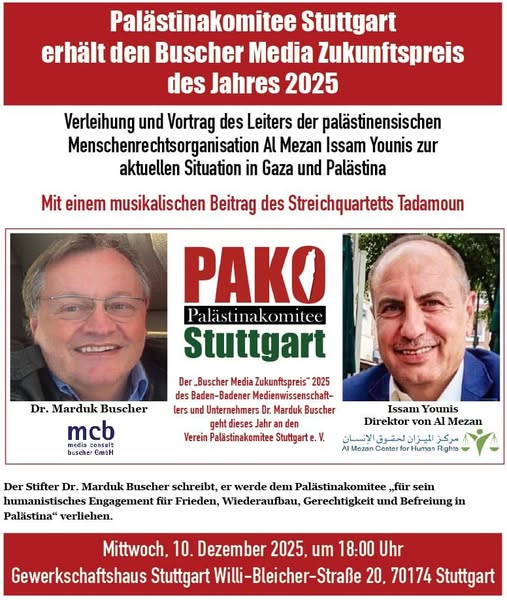 *Dr. Marduk Buscher* *verleiht den Buscher-Media- und Zukunftspreis* im Jahr 2025 an das Palästinakomitee Stuttgart e. V.