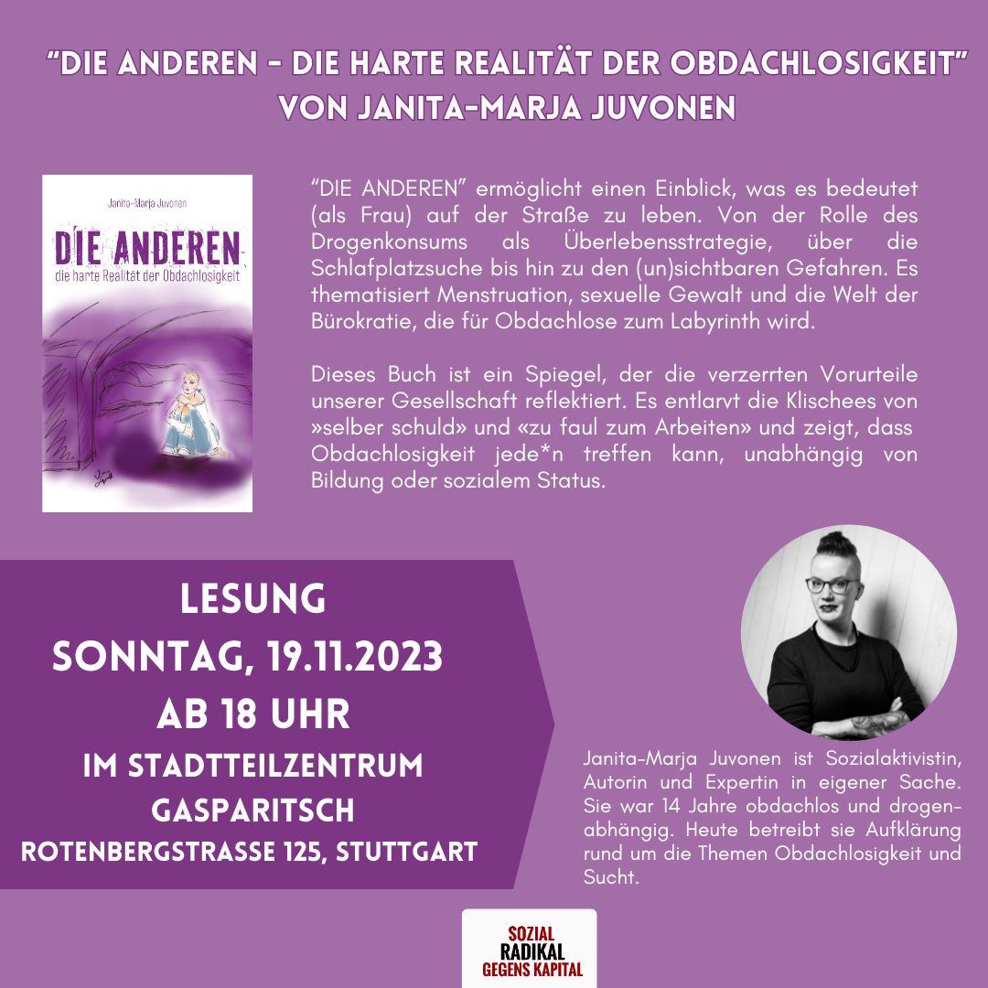 Zur Lesung ihres Buchs "DIE ANDEREN - Die harte Realität der Obdachlosigkeit" kommt die Autorin Janita-Marja Juvonen nach Stuttgart. Janita hat als junge Frau viele Jahre auf der Straße gelebt. Über ihre Erfahrungen, die strukturelle Diskriminierung und Gefahren auf der Straße berichtete sie in ihrem Buch. Neben der Lesung wird es auch die Möglichkeit geben Fragen zu stellen, in den Austausch zu kommen und das Buch zu kaufen. Die Veranstaltung ist kostenlos. Wir freuen uns auf einen spannenden Abend!