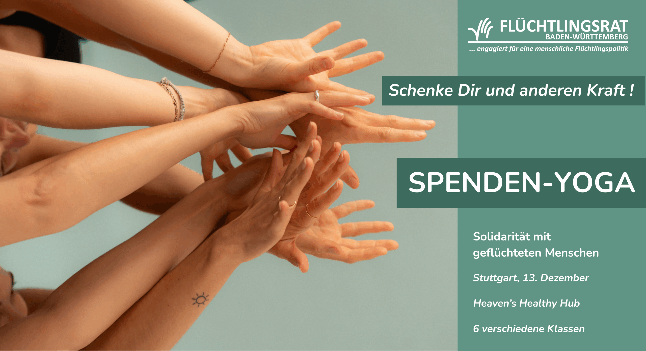 Schenke Dir und anderen Kraft – mit einer von sechs solidarischen Yoga-Stunden, die am 13. Dezember im Stuttgarter Yoga-Studio Heaven’s Healthy Hub (H3) angeboten werden. Alle Einnahmen werden an den Flüchtlingsrat-Baden-Württemberg gespendet – du zahlst so viel, wie du magst.