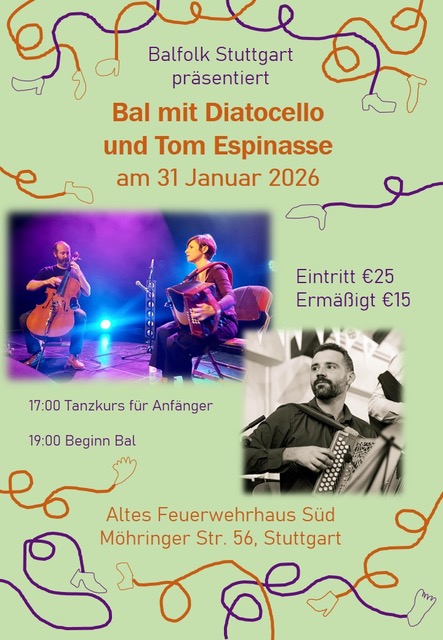 Am Samstag, 31.01.2025, laden wir euch zu unserem nächsten Balfolk-Abend mit Livemusik ins Alte Feuerwehrhaus Stuttgart-Heslach ein.