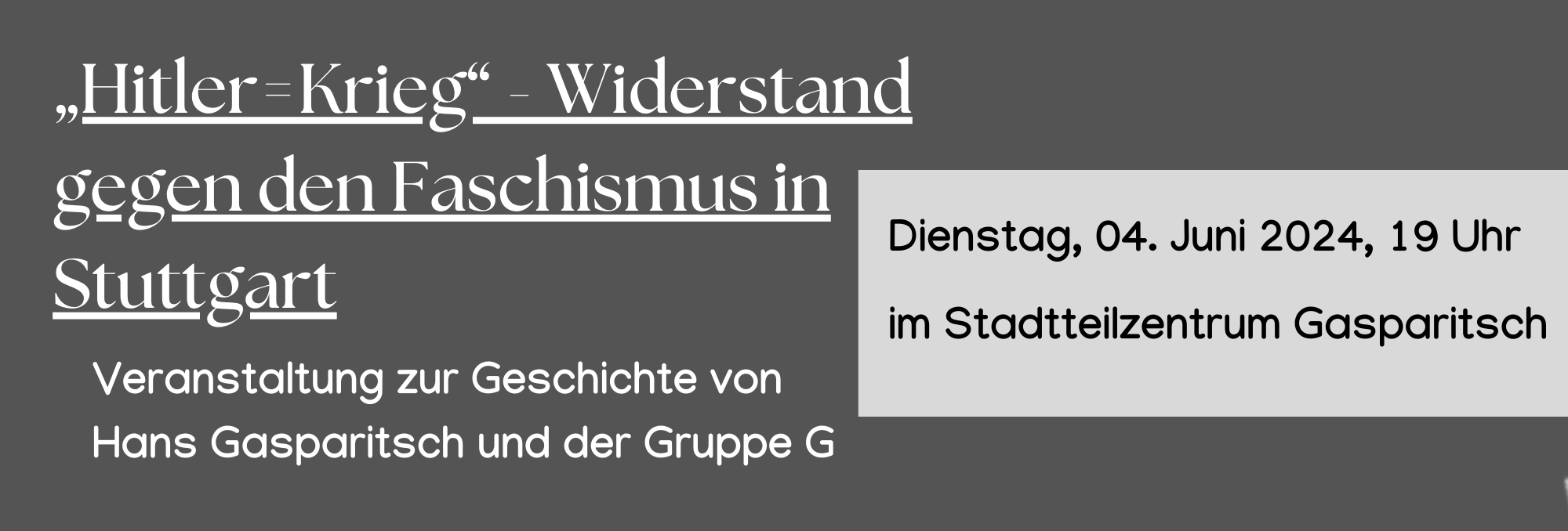Am 14. März 1935 pinselte der damals 17-jährige Schriftsetzerlehrling Hans Gasparitsch neben „Rotfront“ die Parole „Hitler=Krieg“ auf die Sockel der Rossebändiger-Statuen im Stuttgarter Schlossgarten. Dies geschah im Rahmen von Aktionen der Gruppe G - einer Gruppe von Jugendlichen, die Widerstand gegen den Faschismus in Stuttgart und der Region organisierten. Einige Mitglieder der Gruppe G wurden im Zuge der Aktion verhaftet - darunter auch Hans Gasparitsch. Er verbrachte zehn Jahre in Haft und überlebte in den KZs Dachau, Flossenbürg und Buchenwald. Hans Gasparitsch kam zurück nach Stuttgart und engagierte sich bis zuletzt gegen Faschismus, Rassismus und für eine bessere Welt.