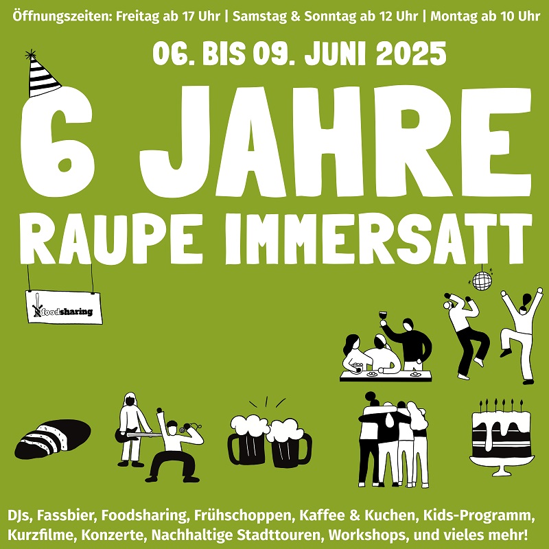 Vom 6. bis 9. Juni verwandelt sich unser Café wieder in ein kleines Festival: Bildung, Foodsharing, Musik und so vieles mehr. Kommt rum, bringt Freund:innen mit und lasst uns zeigen, wie gut sich Utopien anfühlen können. Entdeckt unser Programm hier: https://www.raupeimmersatt.de/aktuelles/