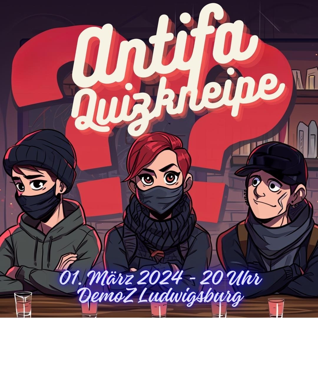 wir laden euch herzlich ein zu unserer Antifa Quizkneipe am Freitag, den 1. März 2024 um 20 Uhr im DemoZ Ludwigsburg. Bei einem spannenden und informativen Quiz wollen wir unser Wissen über die lokale extreme Rechte testen und erweitern. Die Fragen drehen sich um Strukturen, Akteure, Aktivitäten und Ideologien der rechten Szene im Raum Ludwigsburg.
