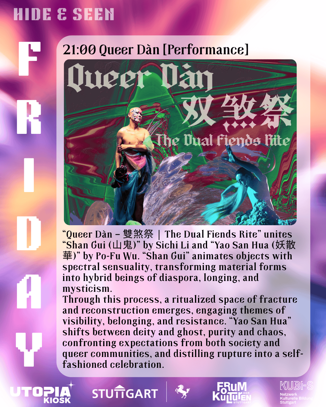 “Queer Dàn – 雙煞祭 | The Dual Fiends Rite” unites “Shan Gui (山鬼)” by Sichi Li and “Yao San Hua (妖散華)” by Po-Fu Wu. “Shan Gui” animates objects with spectral sensuality, transforming material forms into hybrid beings of diaspora, longing, and mysticism. Through this process, a ritualized space of fracture and reconstruction emerges, engaging themes of visibility, belonging, and resistance. “Yao San Hua” shifts between deity and ghost, purity and chaos, confronting expectations from both society and queer communities, and distilling rupture into a self-fashioned celebration. Emerging from Queer Dàn Fantasy (2023), the work extends its decolonial vision, focusing on dual embodiment and ritualized encounter.