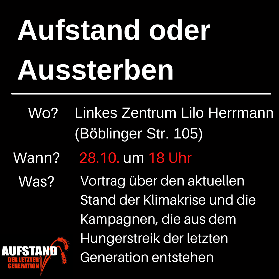 Im Vortrag soll es zunächst um den aktuellen Stand und Dramatik der Klimakrise gehen und welche Zeiträume zum Handeln uns noch bleiben. Außerdem erzählt eine Person vom Hungerstreik über ihre Erfahrungen. Abschließend werden die Kampagnen des "Aufstands der letzten Generation" und "Aufbruch" erklärt. Dabei werden besonders die nächsten Aktionen im November vorgestellt. Schaut gerne vorbei!