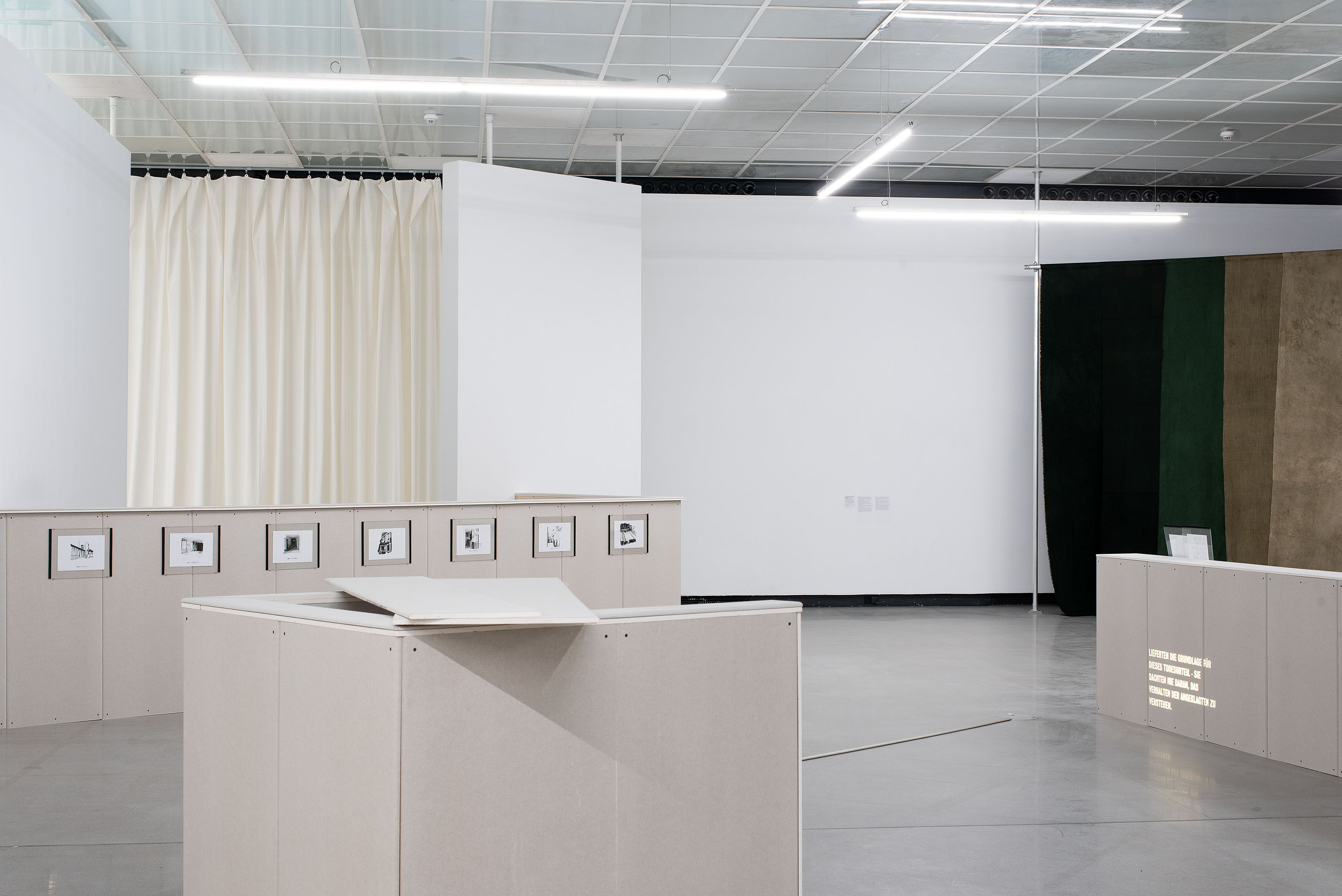 Hurth widmet sich in der Ausstellung drei zentralen Aspekten: den Uniformen der KZ-Aufseherinnen, der Textilproduktion in Ravensbrück sowie den NS-Kriegsverbrecher*innenprozessen in Lüneburg (Belsen-Prozess, 1945), Hamburg (Ravensbrück-Prozesse, 1947–1948) und Düsseldorf (Majdanek-Prozess, 1975-1981).