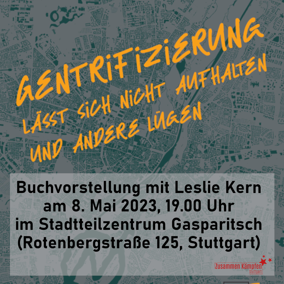 In der Diskussion wollen wir zusammen mit euch darüber sprechen, wie wir Gentrifizierung auch hier in Stuttgart und speziell im Osten erleben. Wie lebt es sich in unserer Stadt und in unserem Viertel? Ist das überhaupt unsere Stadt? Abgebaute Bänke und unbequeme Sitzmöglichkeiten, damit keiner länger verweilen kann, Orte an denen sich Frauen und weiblich gelesene Personen unsicher fühlen und sind, Neubauprojekte wie das EnBW-Areal am Stöckach mit einer Scheinbeteiligung der Anwohner*innen, immer weiter steigende Mieten und vieles mehr. Um das nachhaltige Ziel einer Stadt zu erreichen, die sich nach den Bedürfnissen der Menschen richtet und nicht nach den Profiten, ist es notwendig sich zusammenzuschließen und gemeinsam an vielen Fronten für eine solidarische Stadt für alle zu kämpfen.