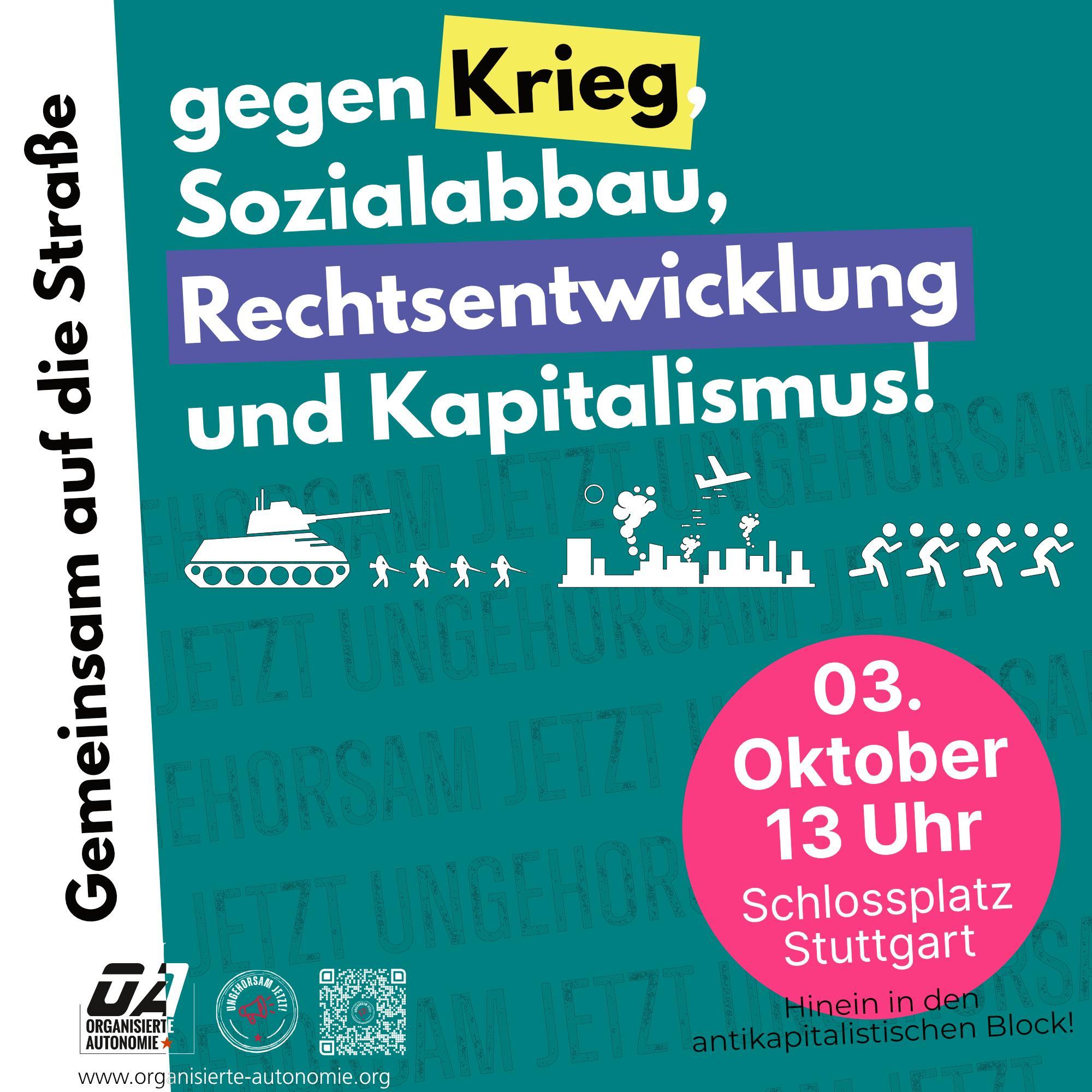 Den gesamten Aufruf für den antikapitalistischen Block am 03. Oktober 2025 in Stuttgart findet ihr hier: https://stuttgart.organisierte-autonomie.org/2025/09/gemeinsam-auf-die-strasse-gegen-krieg-sozialabb...